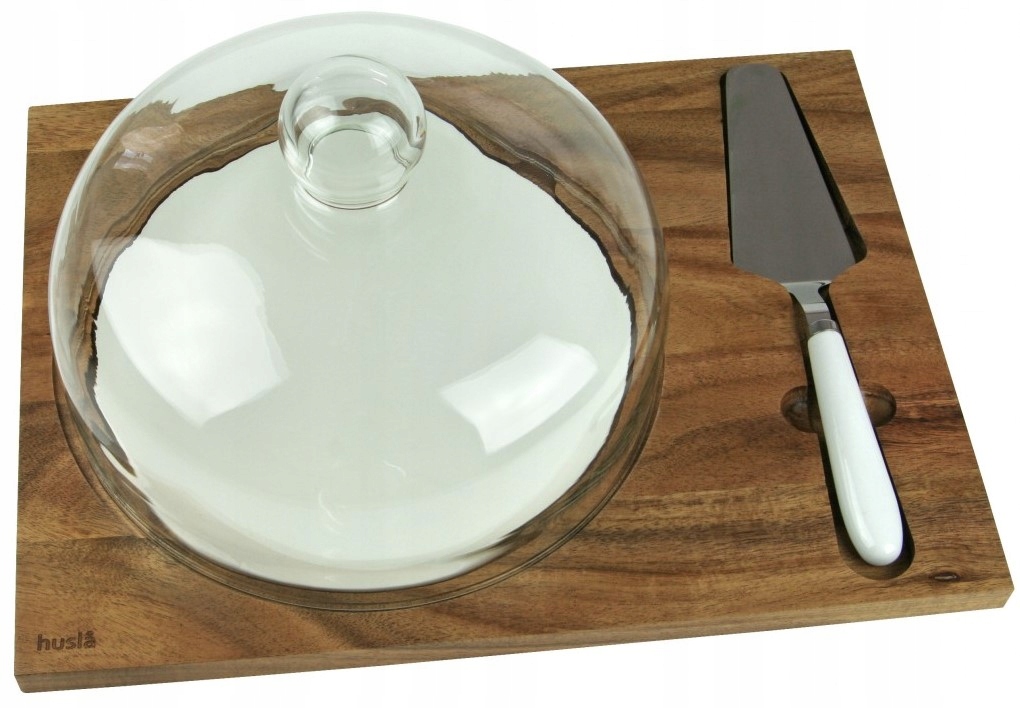 Prezentowana deska przeznaczona jest do serwowania ciast, tortów, serów i innych przekąsek. W zestawie znajduje się deska wykonana z drewna akacjowego, szklany klosz, talerz porcelanowy oraz szpatuła wykonana ze stali nierdzewnej. Deska jest bardzo praktyczna, szklany klosz pomaga w utrzymaniu świeżości serwowanej żywności, jak również zabezpieczy naszą żywność przed owadami i kurzem. Idealnie sprawdzi się na różnego rodzaju przyjęciach.