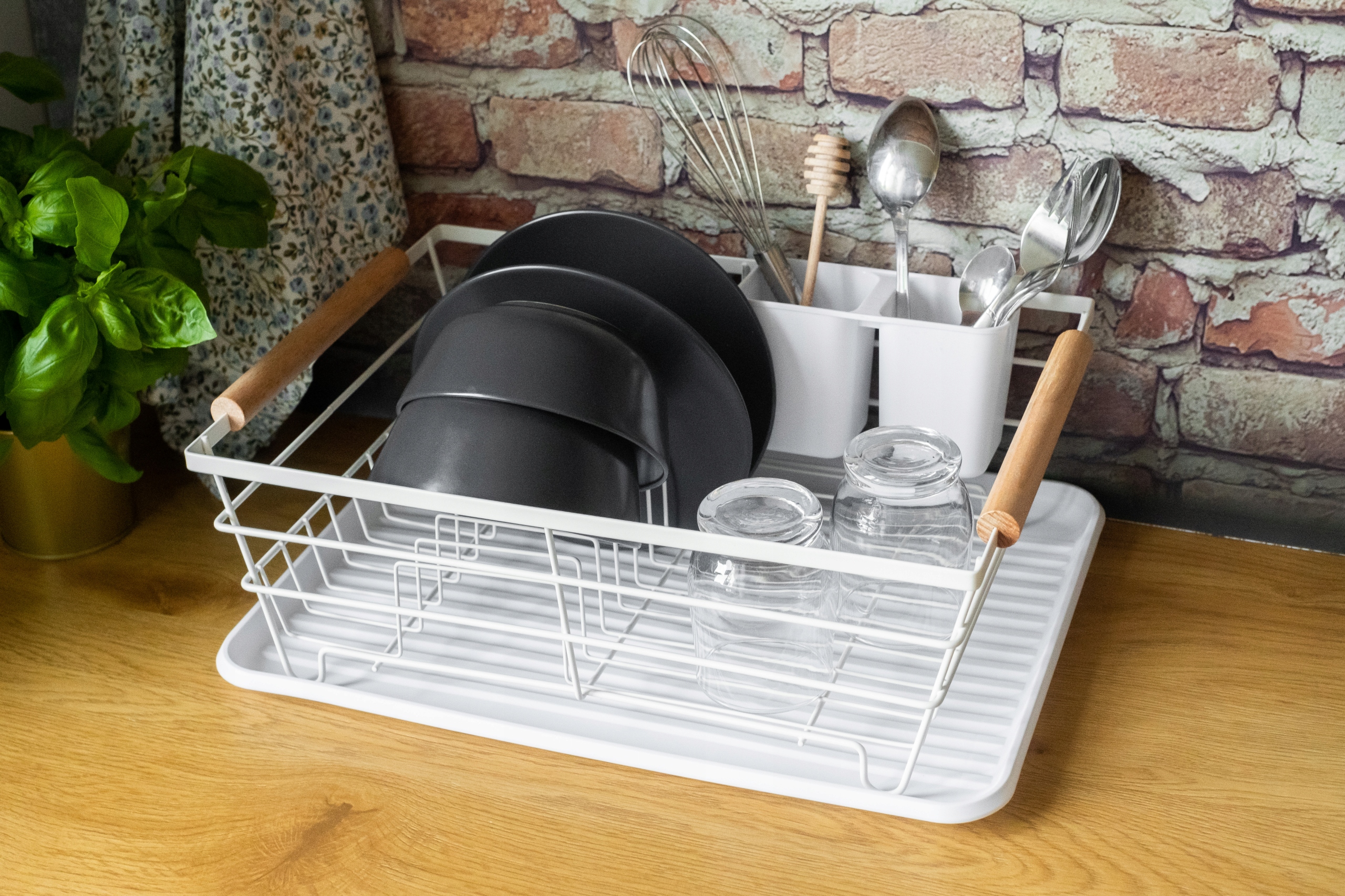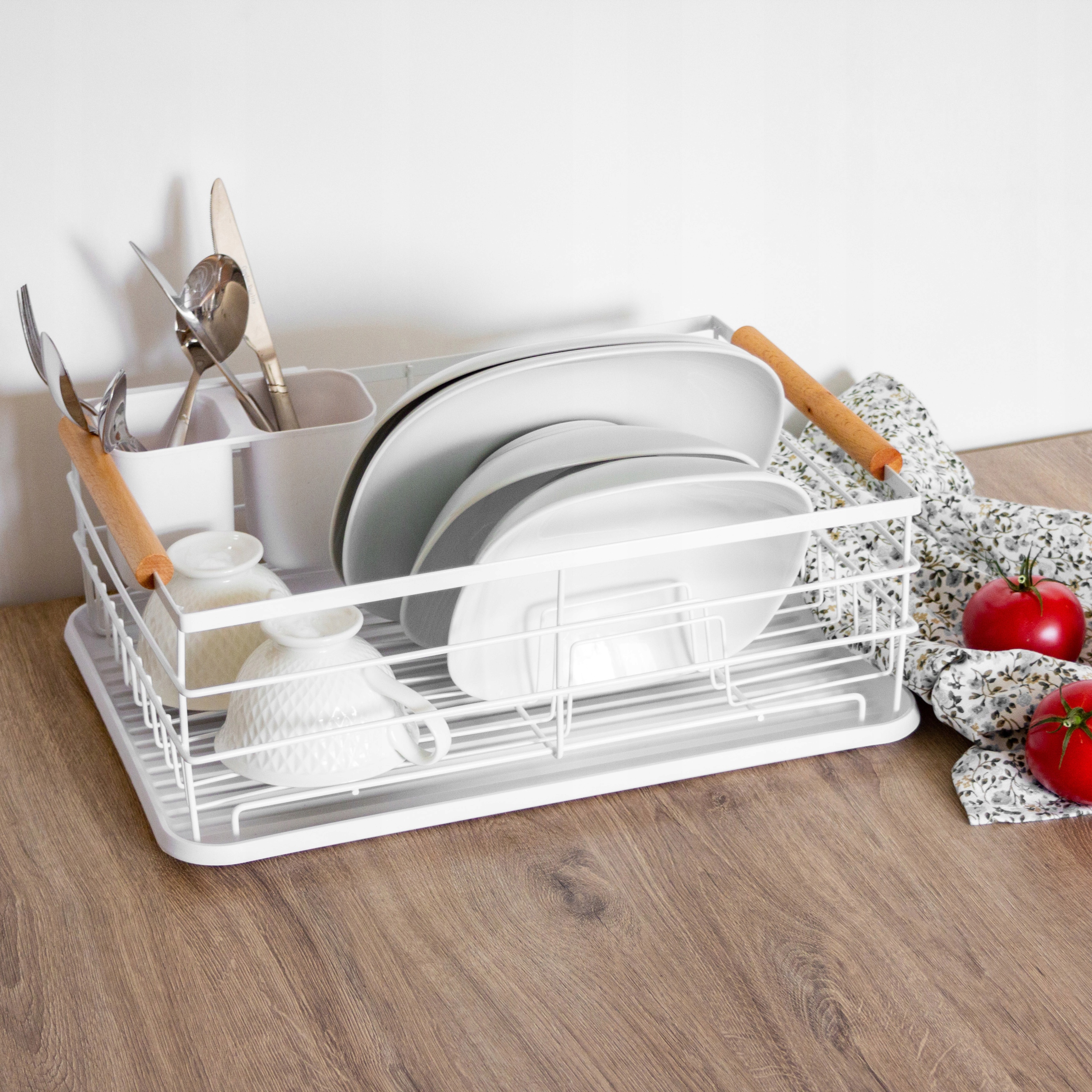 Suszarka oraz ociekasz na sztućce wykonane z metalu pomalowanego proszkowo na kolor biały