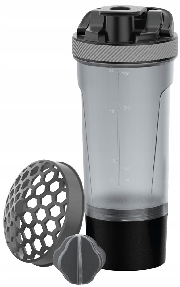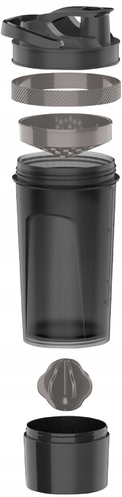 - Dodatkowo posiada pojemnik, w którym można przechowywać suplementy bądź białko. Pojemnik dokręcany do spodu szejkera